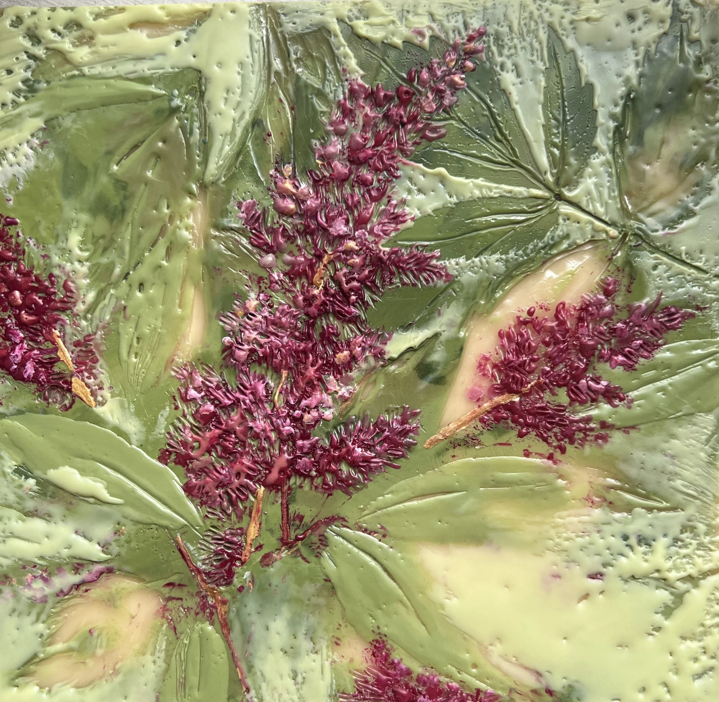 Beautiful deep pink Astilbe blooms adorn this 6” x 6” encaustic painting