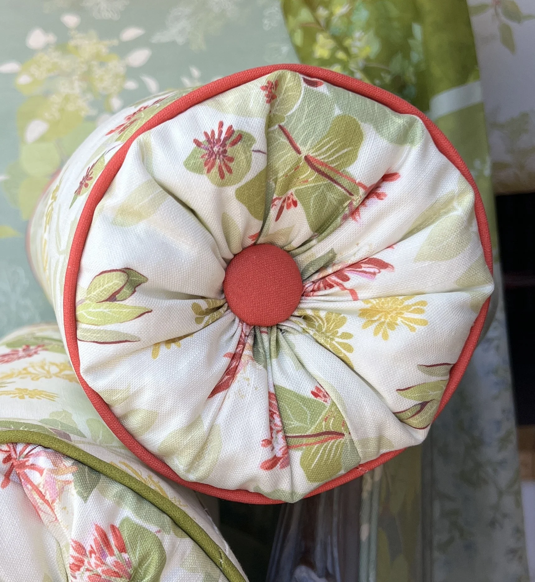 6" x 20" Bolster Pillow with contrast welt, tufted ends, and covered button. Poly Gel Micro Fiber insert included.